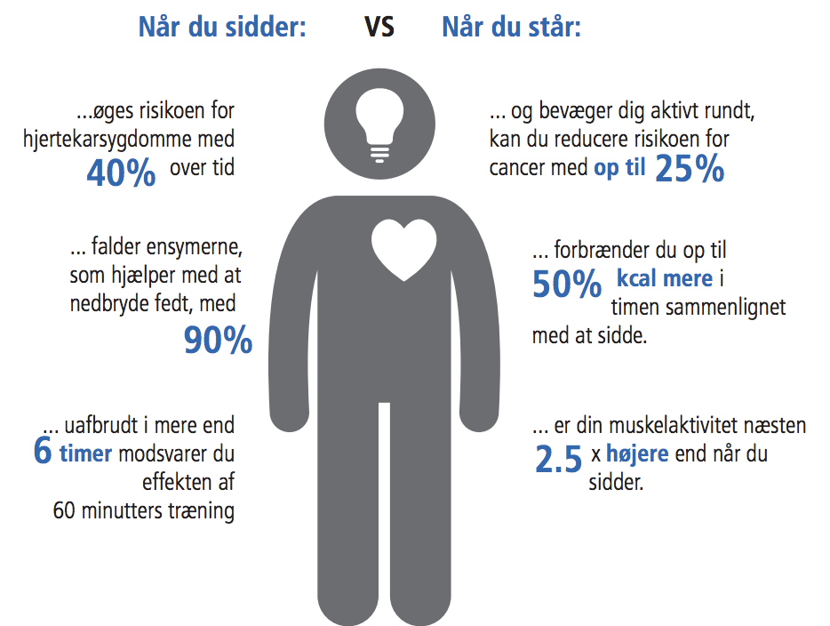 Det er ikke for sjov, når du kan læse avisartikler, der handler om, hvor farligt det er at sidde ned. Der er faktisk noget om snakken. Heldigvis kan du modvirke de negative effekter ved at hæve dit hæve-sænkebord og bruge en del af din arbejdsdag i stående position. Vidste du f.eks., at du forbrænder 50% flere kalorier i timen ved at stå op og arbejde sammenlignet med at sidde på din kontorstol? Og endda kan øge det yderligere ved at stå på et balancebræt til kontor? Mange oplever også en øget koncentrationsevne, når de står mere op - måske vil du opleve det samme og mærke forskellen i din arbejdsdag. Disse og flere facts kan du blive klogere på nedenfor: