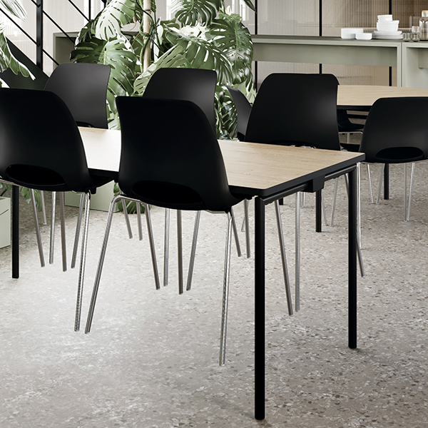 Stilfuldt og fleksibelt konferencebord Enkelt og unikt foldesystem Kan stables op til 10 borde på transportvogn