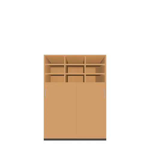 Reol med postindsats brede hylder og låger med lås. Øverst i reolen er indsat en postreol med 9 rum. Denne postindsats er god til sortering af post, opbevaring af kataloger og dokumenter eller brochurer. Korpus, bagbeklædning, hylder, postindsats og låger er produceret i 16 mm møbelplade og kan vælges i en individuel farve. Vælg mellem 16 lak farver, finér eller laminat. Det giver et flot udtryk, at vælge postindsatsen i en kontrast farve til reolen. Ønskes et elegant udseende, kan der vælges træben i eg. Bemærk at højden på reolen bliver 127,2 cm med træben. Som standard leveres reolen med pladesokkel, men vælg den løsning der passer til indretningen. Produktmål: B80xD35xH110,2 cm. Vejledende leveringstid: 3 uger