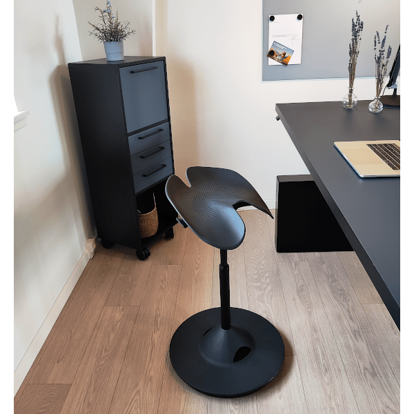 Backapp Hipp ståstøttestol, er en ny variant af den klassiske Back App 2.0 kontorstol, hvor man med den unik og moderne teknologi træner, selvom man sidder og arbejder. Ved at balancere på stolen, træner du rygsøjlen. Backapp Hip har et ergonomisk, fleksibelt og blødt sæde produceret af genbrugsmateriale. Ved lår og bagkant er sædet fleksibelt, så det passer til forskellige mennesker. Derudover er sædet ventileret og har en komfortabel form, så det passer til alle. Sædet kan vælges i sort, rødt eller hvidt. Søjle samt fodplade er sortgrå. Fodpladen er lavet af et støddæmpende materiale, som egner sig til fødderne. Hipp er perfekt til arbejdspladser med skiftende medarbejdere, eller fællesområder hvor der er brug for kortvarige arbejdspladser. Biblioteker, fælleskontor, hjemmekontor, eller bare en ekstra stol, når man trænger til at sidde mere aktivt. Vippe funktionen kan varieres på kuglen under foden, så man selv kan bestemme, hvor meget man træner musklerne i rygsøjlen. Bevægelserne kommer naturlig, når man sidder og balancerer på Backapp Hipp.