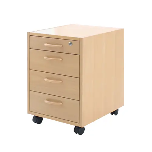 Mobilt skuffemodul med 4 skuffer til Conset bord Modulet leveres i bøg eller ahorn. Hjulene er i sort plast. Alle skuffer har kugleføring, så de løber let og holder længe. Leveres som standard med lås i øverste skuffe og bremse på 2 hjul. Højden er tilpasset, så den passer med Consets hæve-sænke borde i laveste position. Leveres monteret, dog skal hjul og greb skrues på. Materialer: Bøg eller ahorn finér. Mål: 58x40x50cm (HxBxD), højde inkl. hjul. Vejledende leveringstid: 5 hverdage