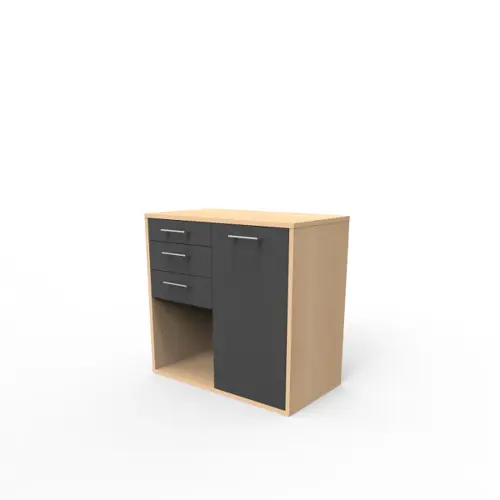 Den skønne og enkle JIVE 204 reol med en 2-rums-låge og skuffesæt med 3 skuffer er et rummeligt og praktisk opbevaringsmøbel til kontor. Reolen er 74,4 cm høj, 78 cm bred og 42 cm dyb, og består af 4 rum, 2 lukkede, en skuffe og ét åbent rum. De forskellige rum gør at reolen har mange anvendelsesmuligheder samlet i ét møbel, hvilket kan være en fordel når man i hverdagen kan opleve forskellige opbevaringsbehov. Med JIVE reolen kan du gemme dokumenter væk bag lågen, have mapper og bøger frit tilgængeligt i det åbne rum og have styr på småting, kuglepenne og andet i skuffen. En smart og funktionel reol, hvor du selv har indflydelse på reolens samlede udseende. Korpus fås i bøge finér og antracit Decor laminat med alu greb. Vælger du korpus i bøge finér har du også muligheden for at vælge låge og skuffesættet i enten bøge finér eller antracit Decor laminat. JIVE reolens understel kan vælges i flere varianter, der kan være med til at bestemme funktionen på reolen. Du bestemmer selv hvilket udtryk og funktion du ønskerdig for din egen, unikke reol. Reolen kan også fås med integeret lås. Har du behov for flere låsekoder, kontakt os venligst på info@kontormoebler.dk Produktmål: B78xD42xH74,4 cm Vejledende leveringstid: 3-4 uger
