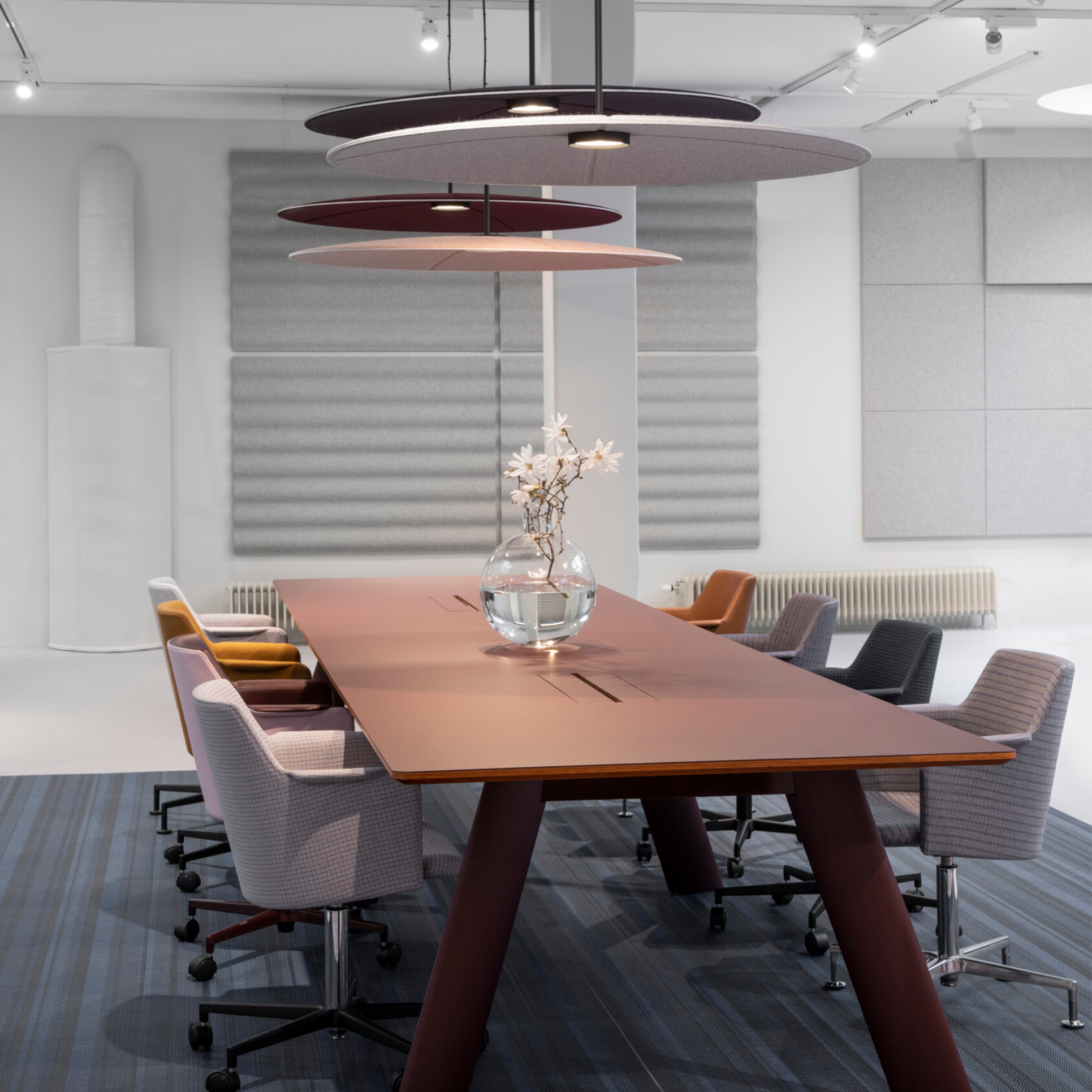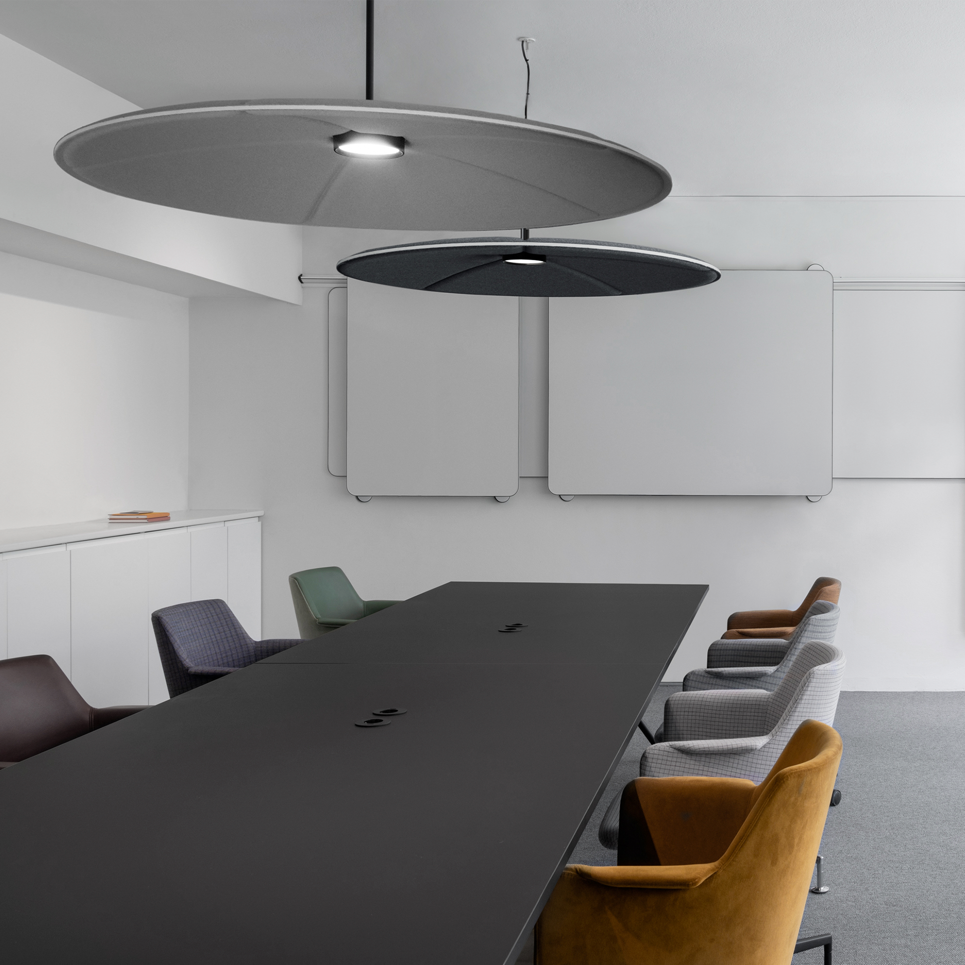 To størrelser: Ø900 / Ø1200 Lydabsorption + belysning Flere tekstiler, kontakt os for muligheder
