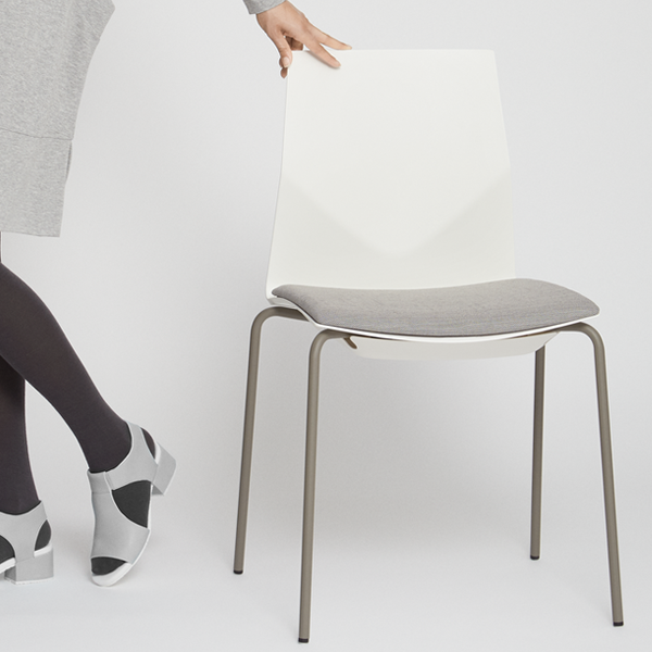 Kantinestol med akustikdæmpende teflon glidere Fleksibelt materiale giver stor bevægelsesfrihed Flere farver og polstringer, mulighed for armlæn